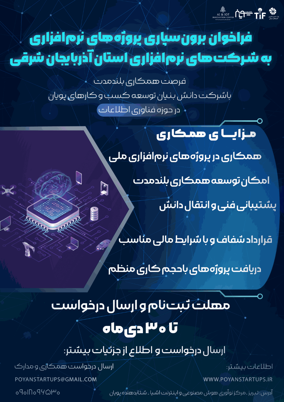 شرکت دانش بنیان توسعه کسب و کارهای پویان ، به عنوان یکی از پیشروان صنعت فناوری اطلاعات کشور، در راستای توسعه همکاریهای منطقهای و حمایت از کسبوکارهای محلی، از شرکتهای نرمافزاری کوچک و متوسط مستقر در استان آذربایجان شرقی برای همکاری در اجرای پروژههای نرمافزاری دعوت به عمل میآورد.