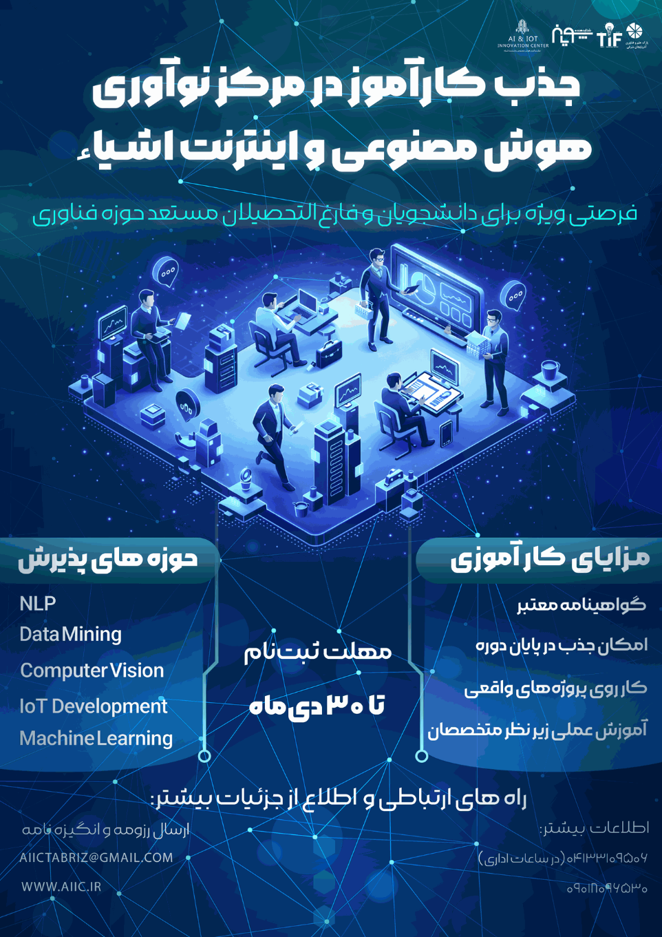 مرکز نوآوری هوش مصنوعی و اینترنت اشیاء در راستای توسعه توانمندیهای نسل آینده فناوری، از دانشجویان و فارغالتحصیلان مستعد برای دورههای کارآموزی دعوت به عمل میآورد.